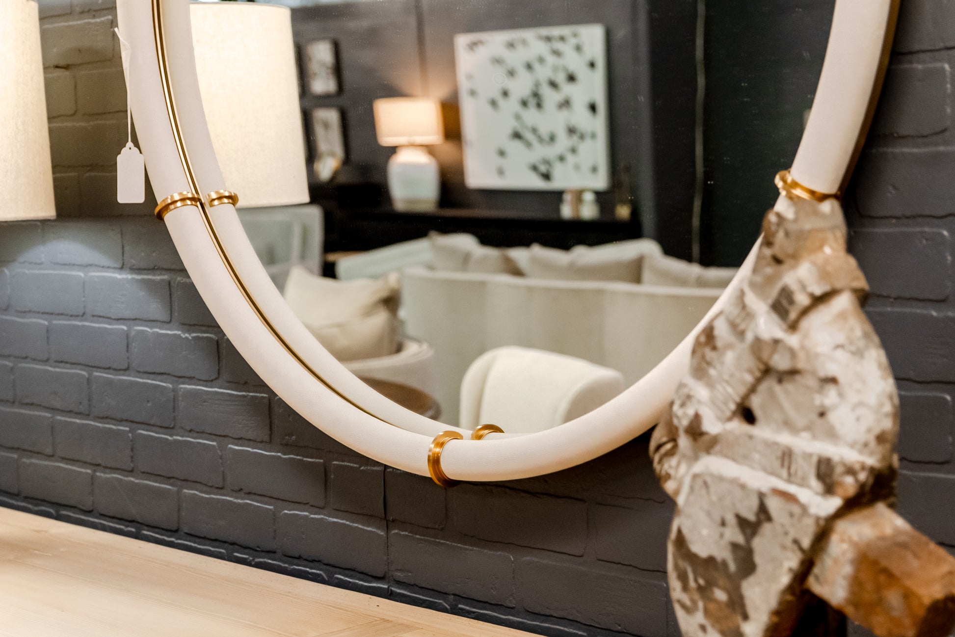 The Cyprus Round Mirror features a refined white faux shagreen wrap, accented by sleek brass-plated steel bands. The combination of textures and metallic details adds a touch of modern sophistication to any space.