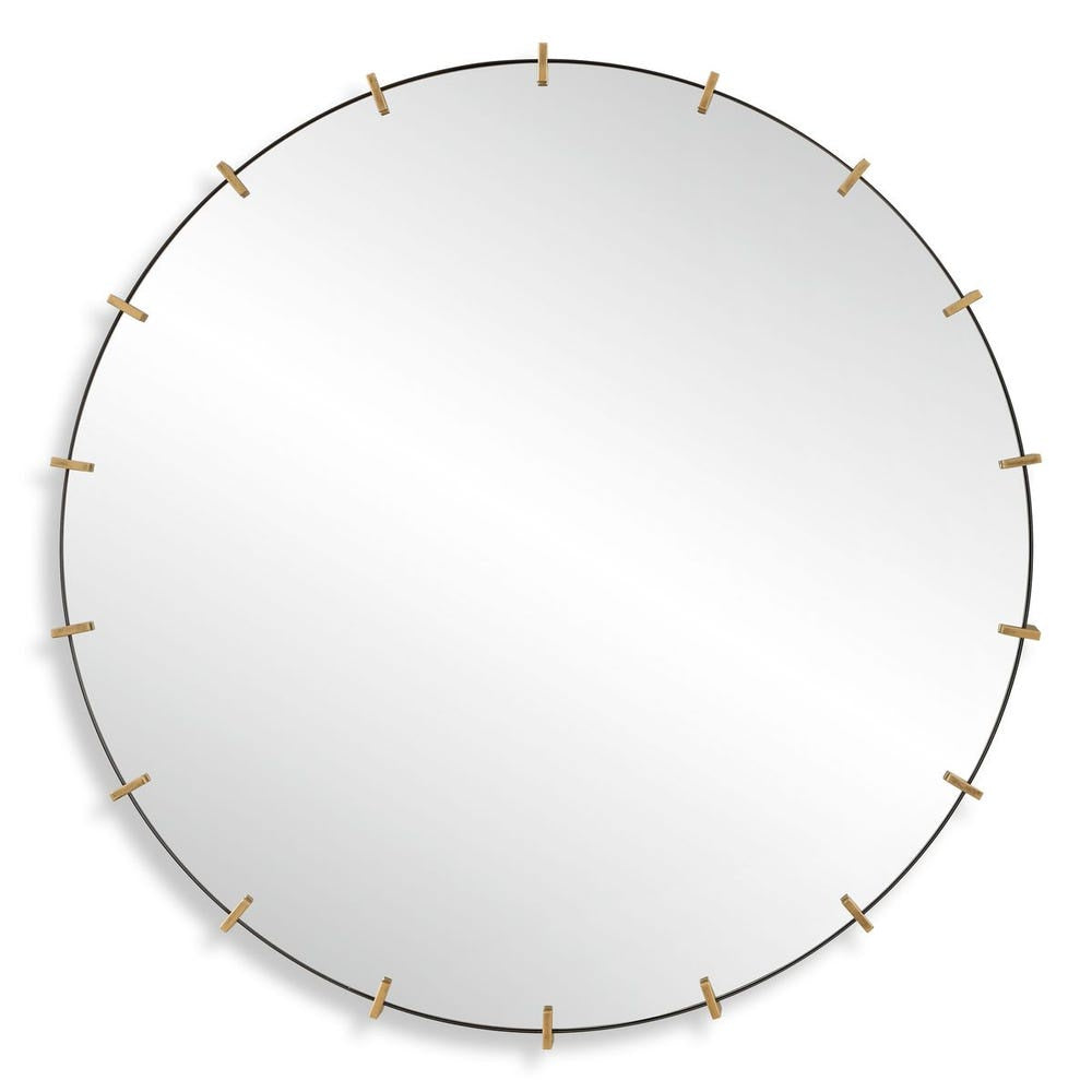 The Pali Round Mirror blends modern and industrial aesthetics with a sleek black iron strap frame, highlighted by subtle brushed gold accents. Its floating polished-edge mirror adds a sophisticated touch to the design.