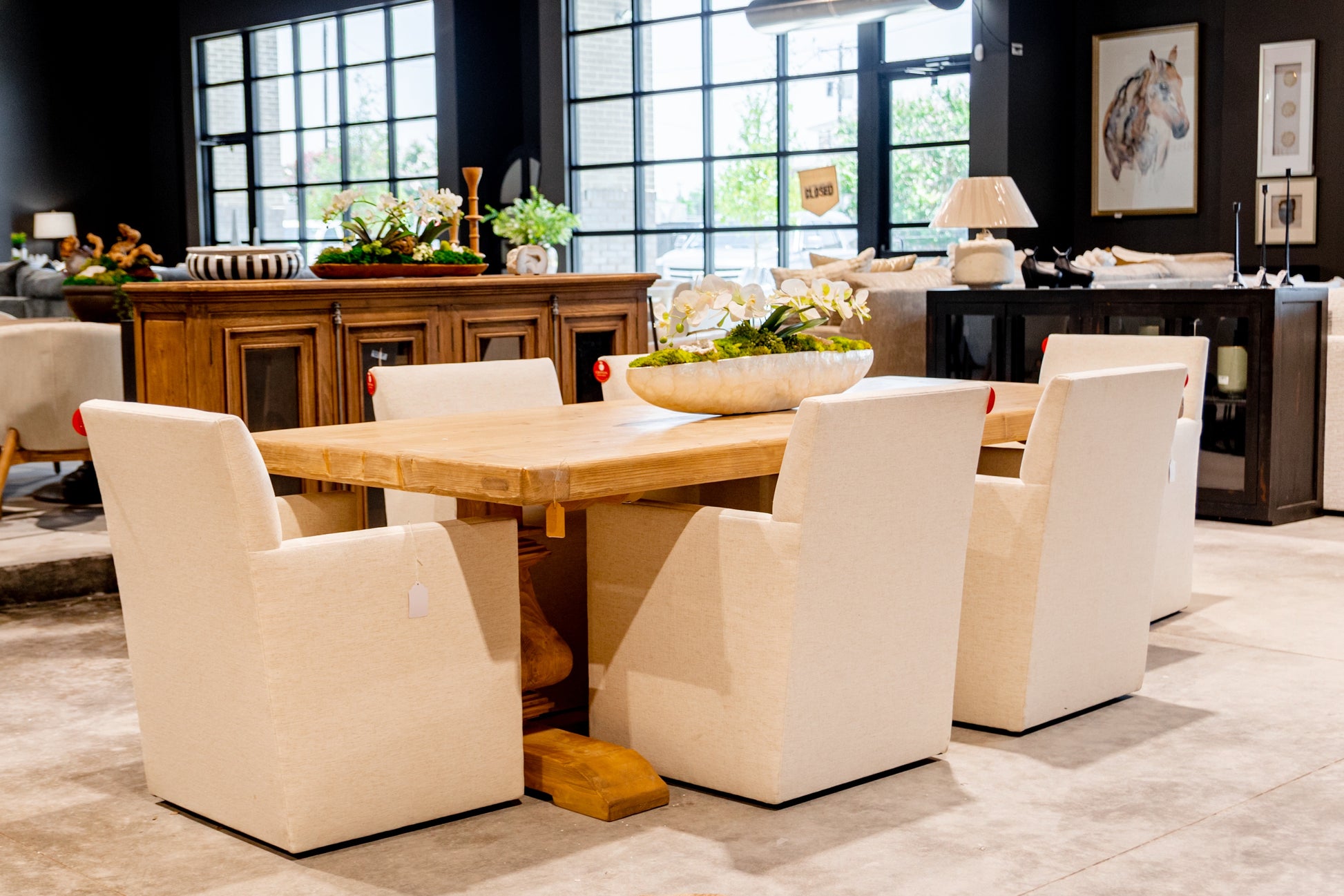 Made in America Chair. Has rollers. Bleach cleanable performance fabric. Stunning dining chair! In store pickup or deliver for a small fee.