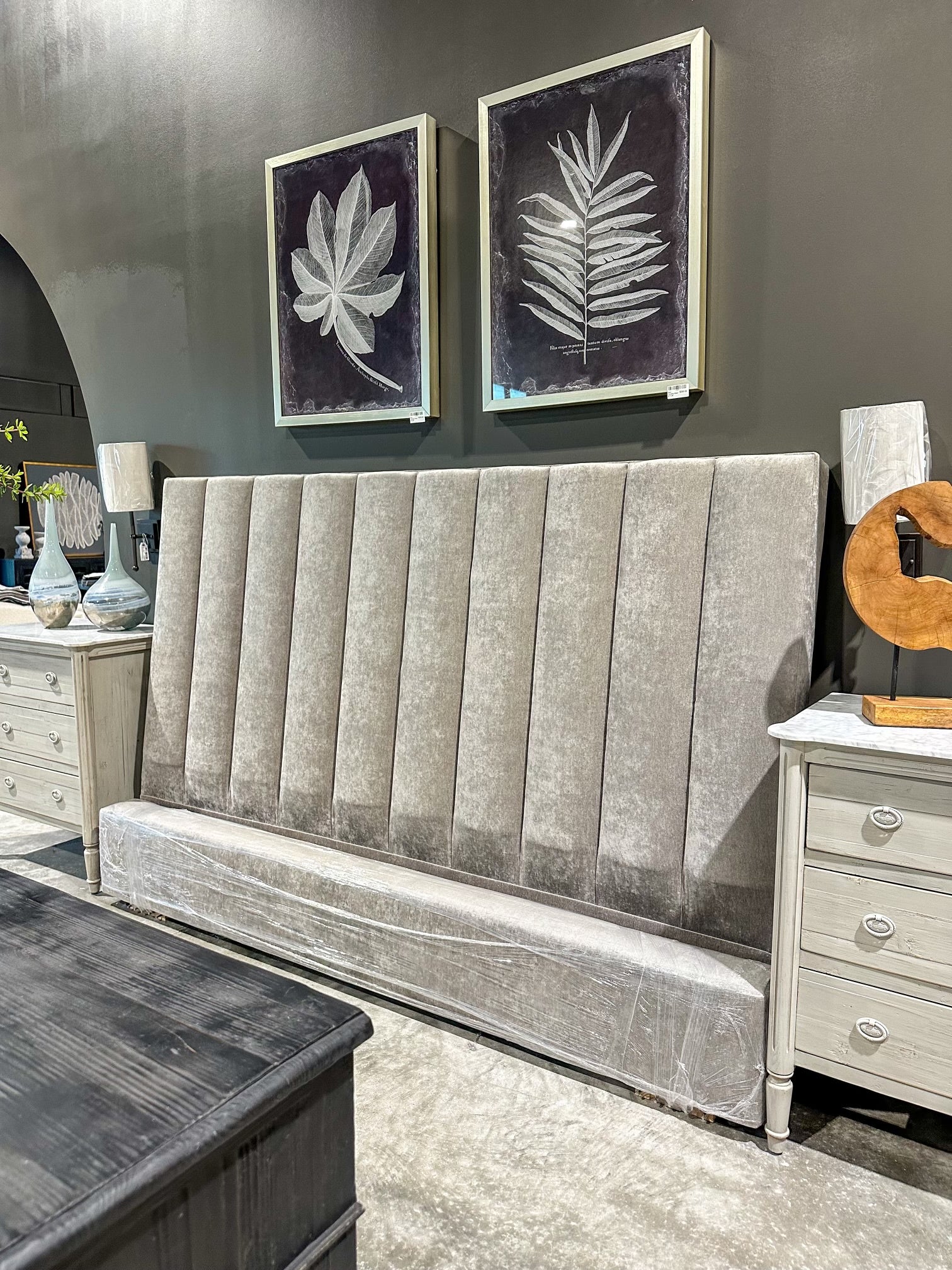 Stunning Light grey velvet channeled king bed. Comes with side board, foot board and inside wood.