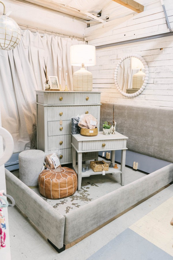 Low profile king bed, grey suede. BRAND NEW. Comes with side rails, rails and footboard.