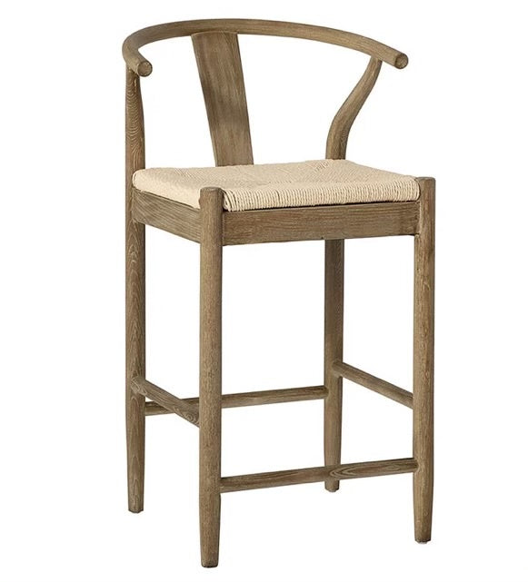 A trendy take on a classic mid-century modern favorite. This counter stool stands out with its curved, oak wood frame and craft paper woven seating. The woven seat adds an organic feel to the sculptural form and cutout back design. Certainly, a statement piece.